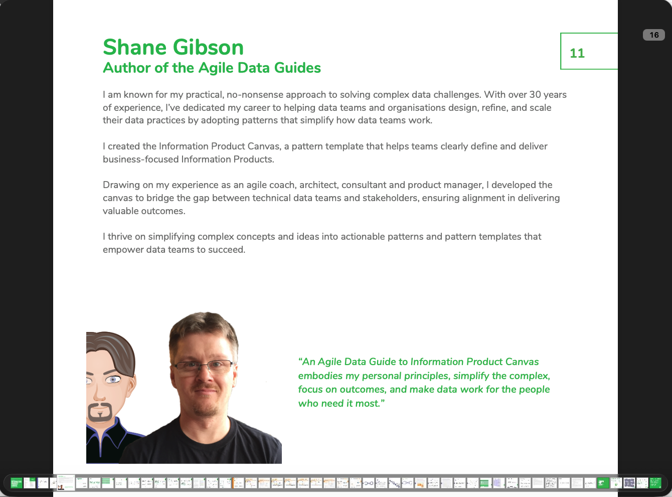 Created by Shane Gibson, Agile Data Coach and author of the Agile Data Guides, drawing inspiration from the proven Agile Data Way of Working, this guide introduces the Information Product Canvas. It's a simple, clear, and concise pattern template specifically designed to quickly discover and capture data and information requirements in a repeatable way.
